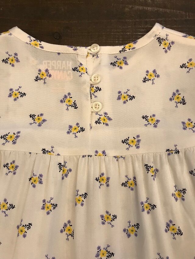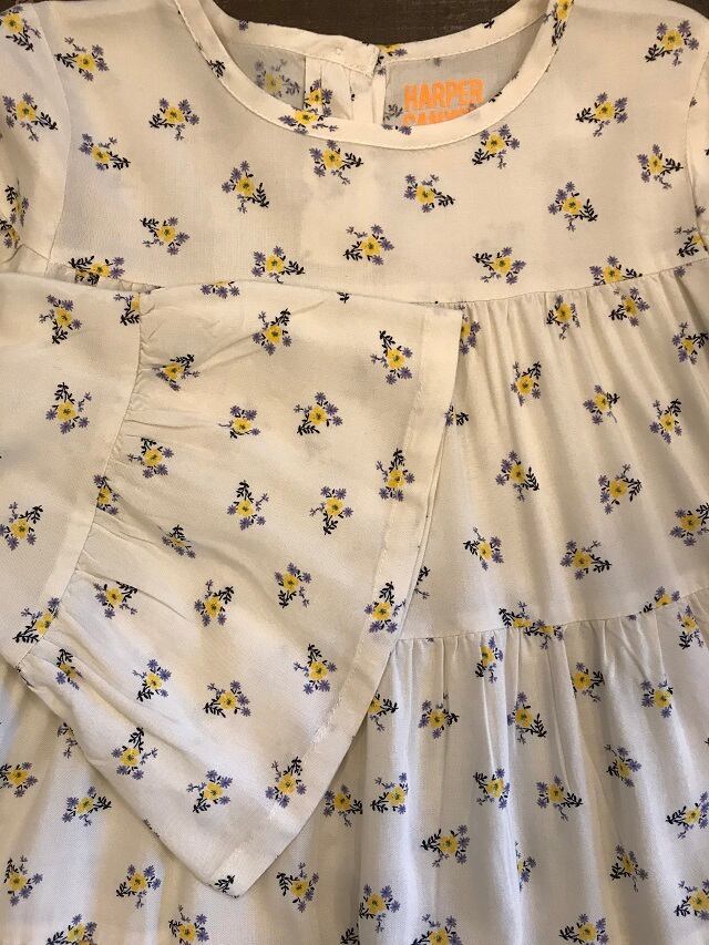 小花柄に3段の切替しのAラインになっていてふんわりしたシルエットがとってもかわいいドレスになっています。