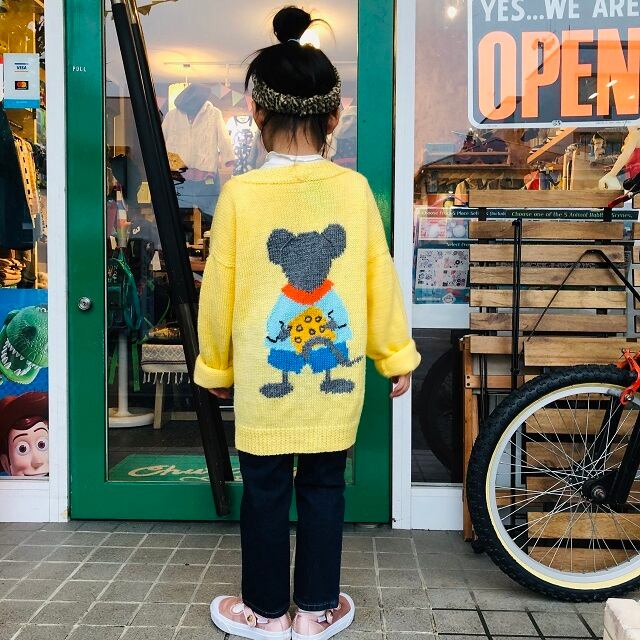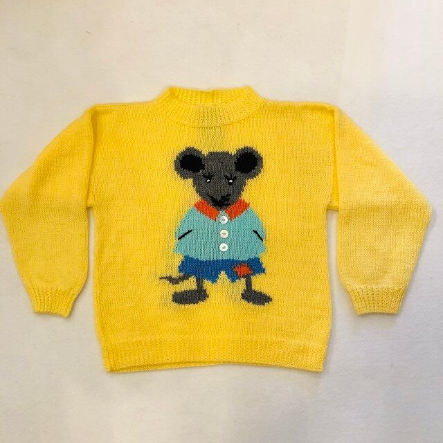 フロントには正面向きのネズミ、バックにはチーズを隠し持ったネズミの後ろ姿が編み込まれてユーモアのあるニットになります。とても柔らかく肌触りの良い生地になります。
