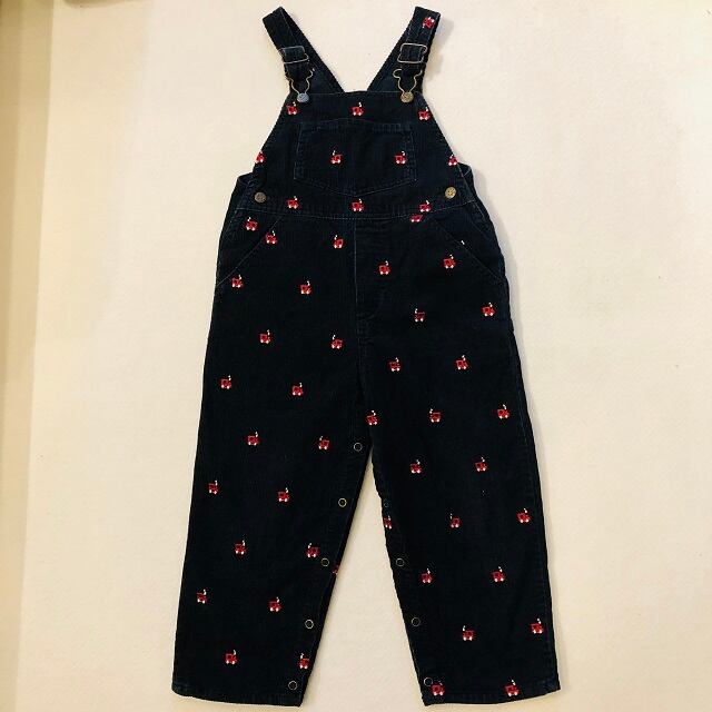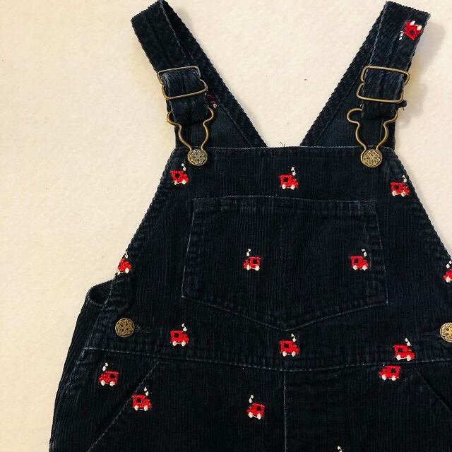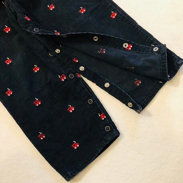 コーデユロイの生地に車の刺繡がされたとても可愛いオーバーオールになります。足の内側全面がスナップボタンとなっております。