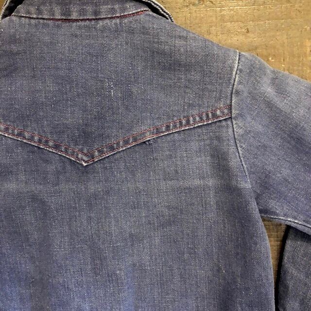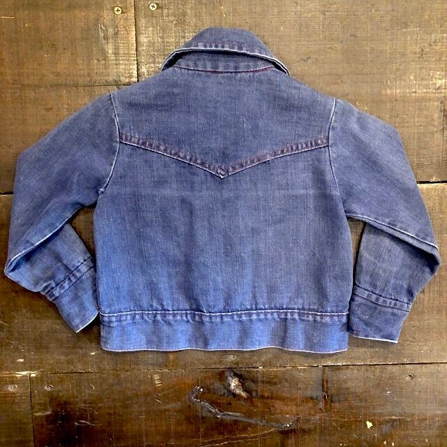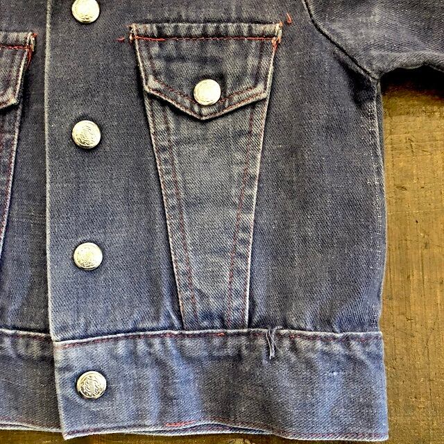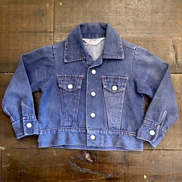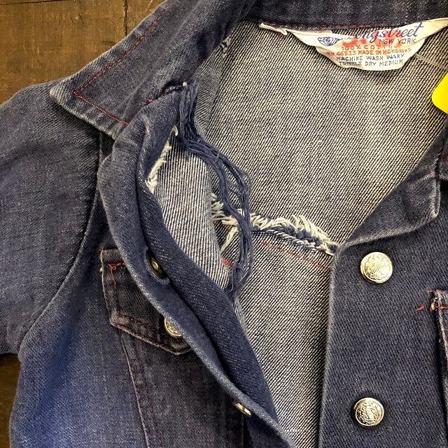 USED LONG STREET デニムジャケットになります。赤色のステッチ・デザインがとてもかわいいです。サイズが不明なのですがモデル110㎝でギリギリで着用できました。