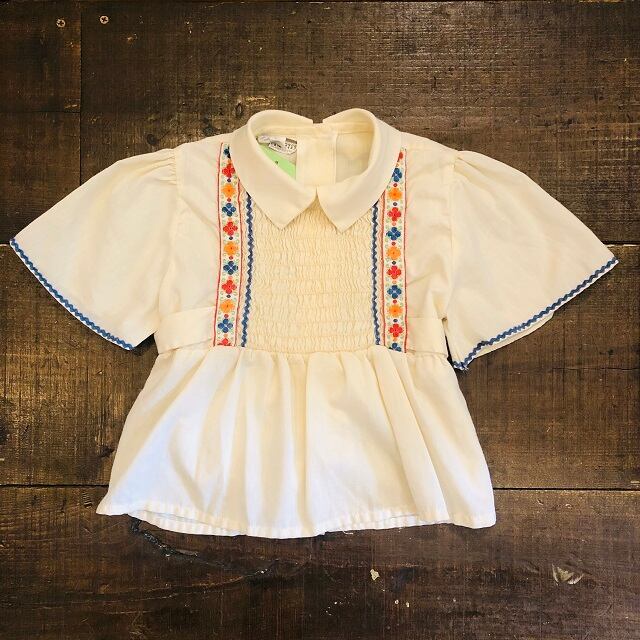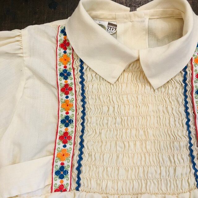 USED MONGOMERY WARDモンゴメリーワードのチュニックシャツになります。胸元のギャザーと刺繡がとっても可愛い1枚です。ウエスト部より紐が出ており前又は、後ろで結んで着用となります。
