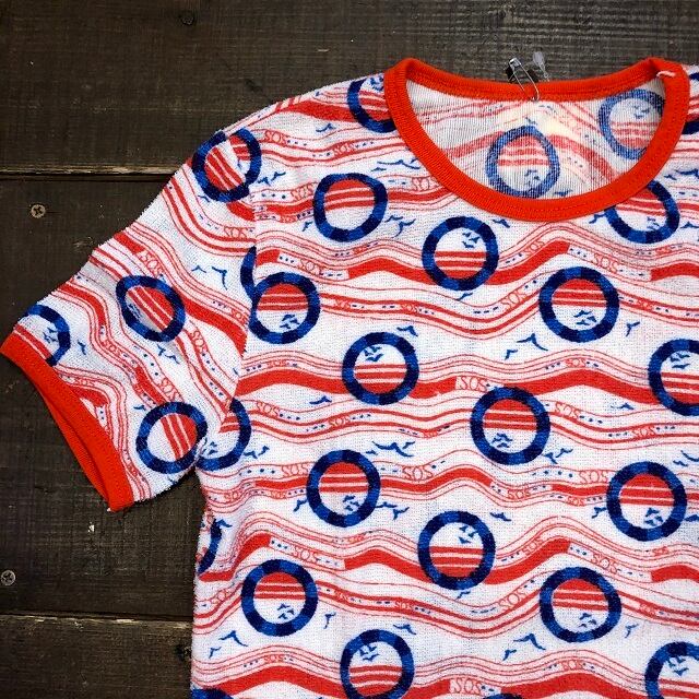 USED カモメ・ウキワ・SOS柄のリンガーTシャツになります。襟ぐり・袖口がレッド色となっておりデザインのアクセントとなっております。涼しげな肌触りのTシャツになります。