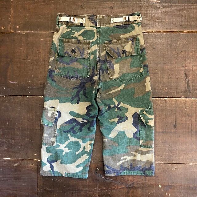 USED 迷彩パンツになります。サイズ12Yですが、レングスが短くリメイクされております。
