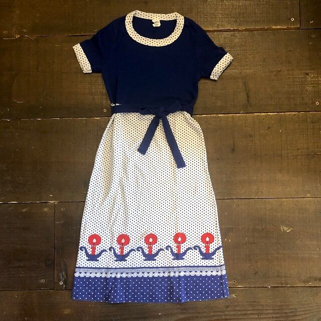 USEDドット柄ドレスになります。細身のシルエットですが、伸びの良い生地なので締め付け感はございません。ウエストのリボンは 左側で縫われ、取り外しはできません。