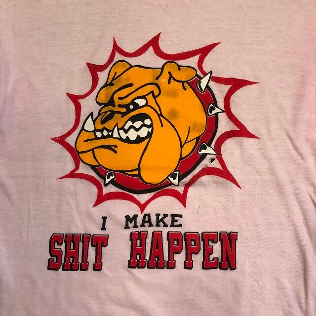 USED 80s FANTASY Tシャツ Sサイズになります。強そうなブルドッグにI MAKE SHIT HAPPENのスラングが良い感じです。使用感、色あせ、左下腹部辺りに10mm程度のダメージ、両袖にリペアーが御座いますが良い雰囲気となっております。