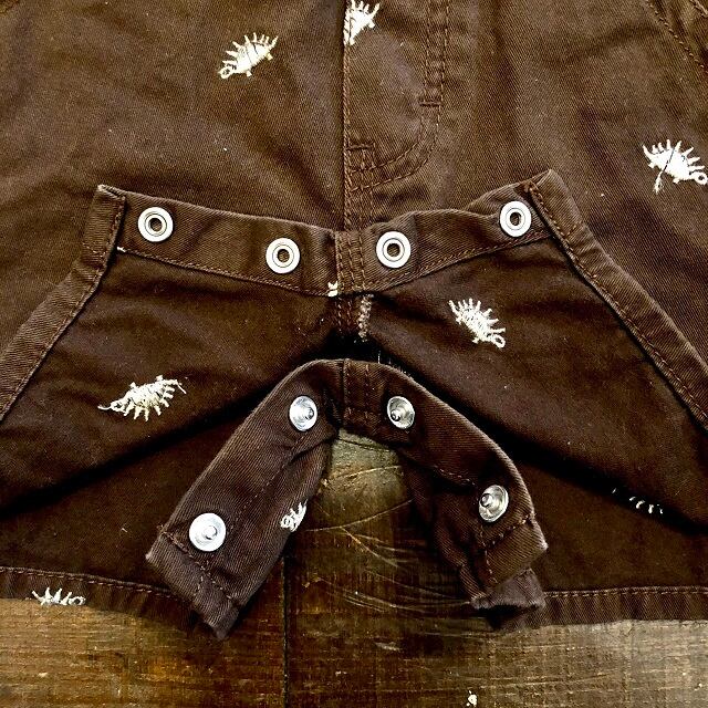 ブラウンのボディーに恐竜の刺繡が入っていて可愛い1着です。