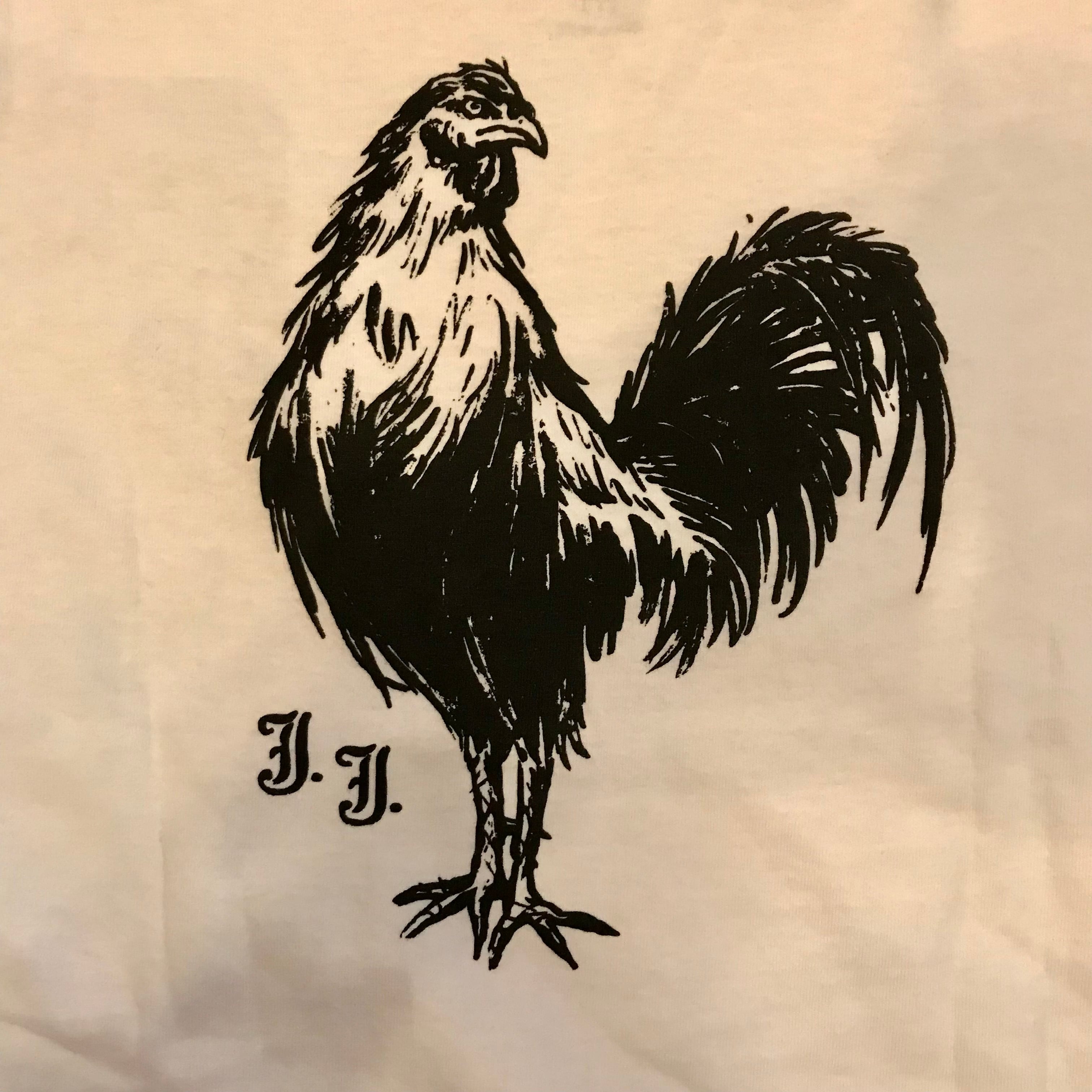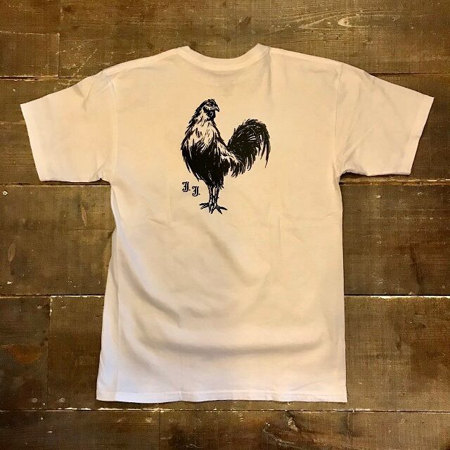 左胸に鶏のプリント、バックにも大きく鶏のプリントが入っています