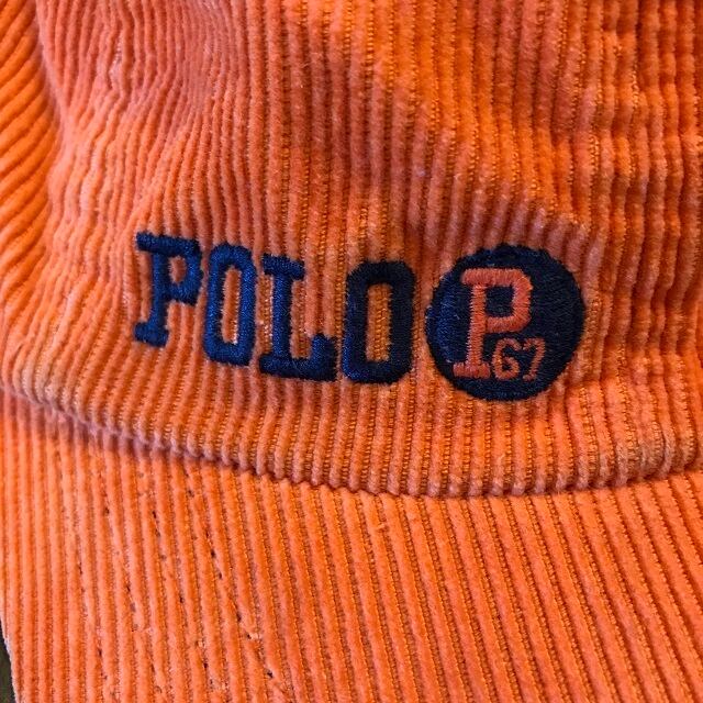 オレンジ色のコーディロイにフロント左側にネイビーでPOLO P67の刺繡が入って