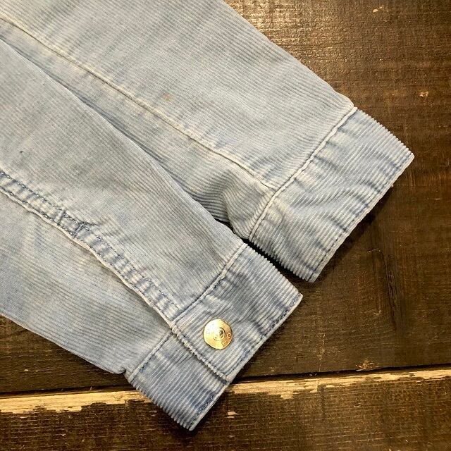 ライトブルーコーディロイにボタンホール、袖カフス、裾内側がヒッコリー生地と